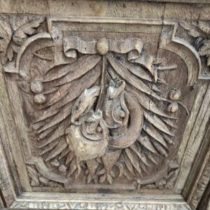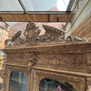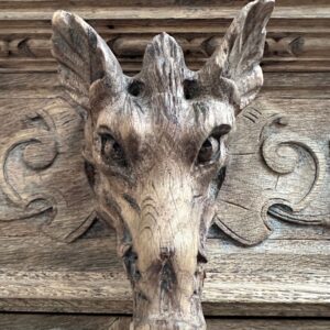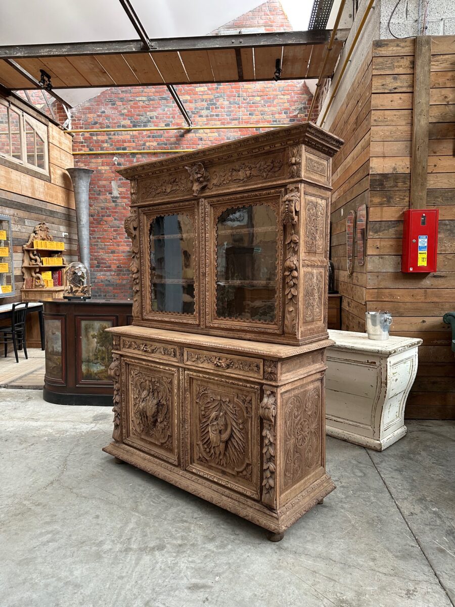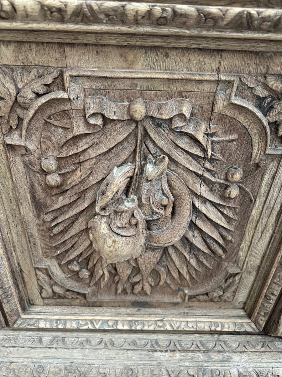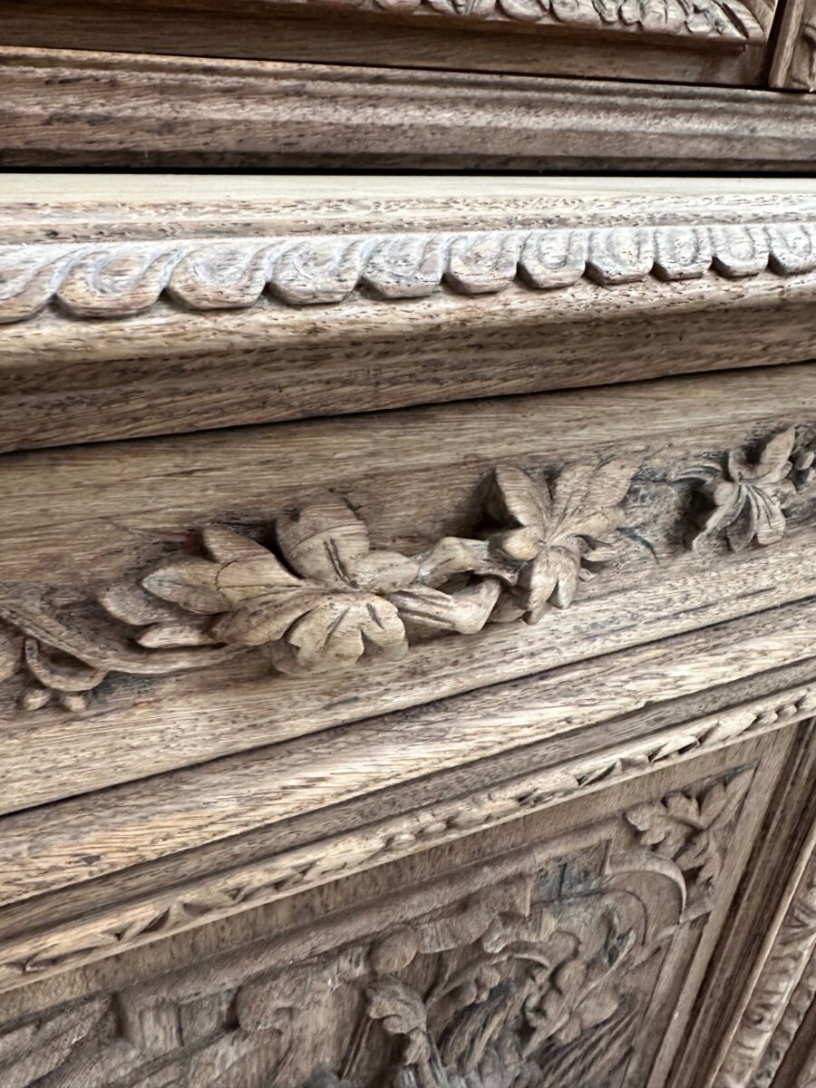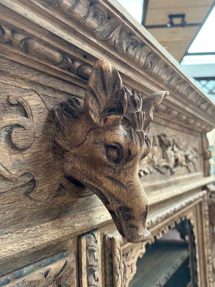 L’intégralité du meuble est en bois sculpté de différents motifs animaliers ou floraux.