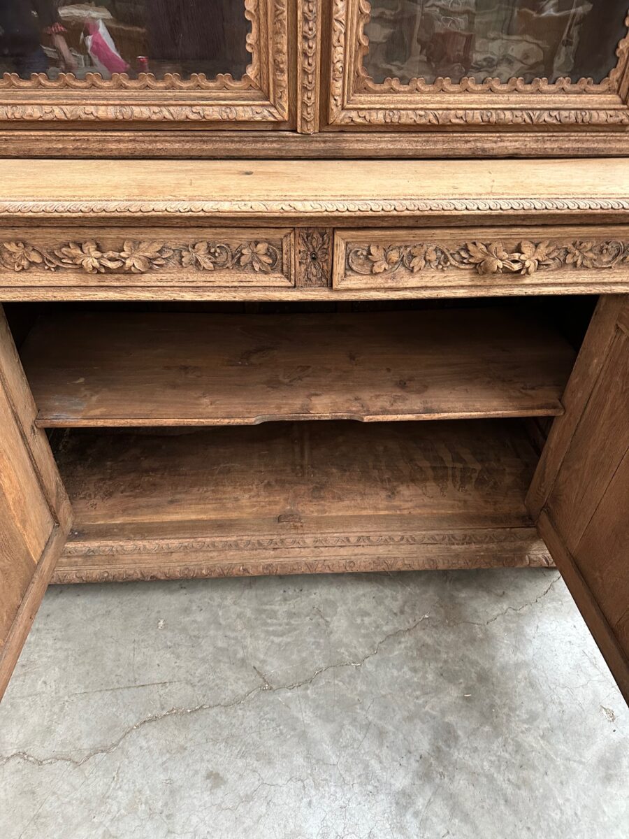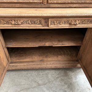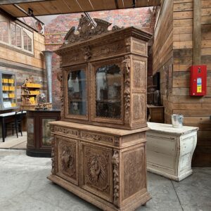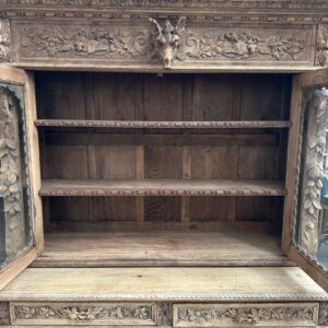 Sa partie haute dispose d’un fronton amovible et de 2 portes vitrées ouvrant sur des étagères.