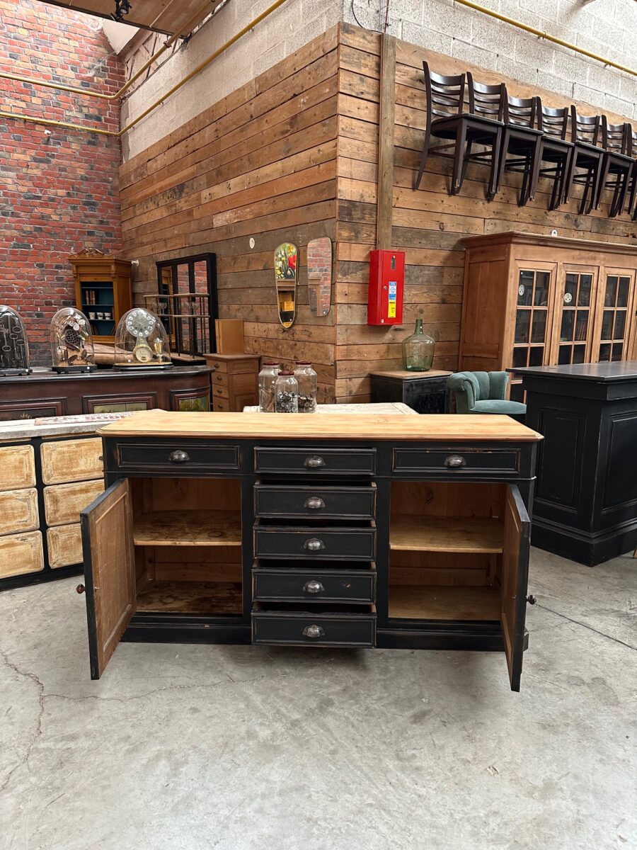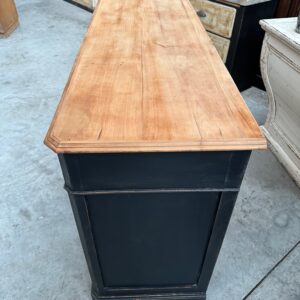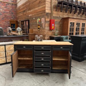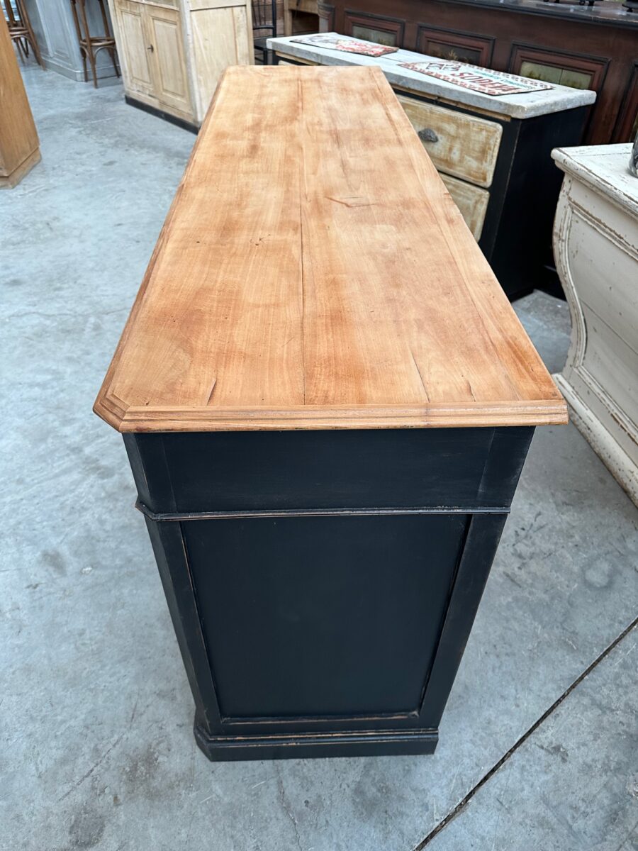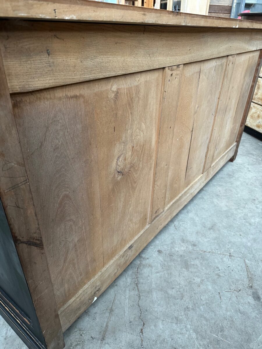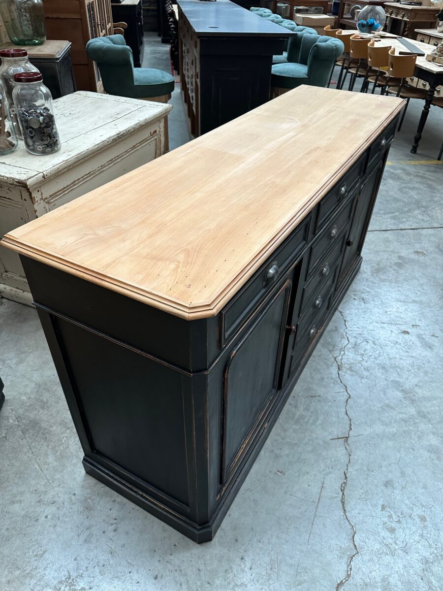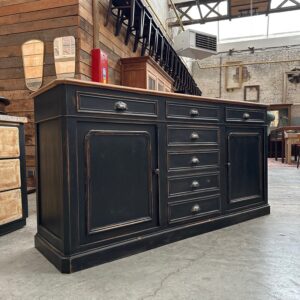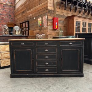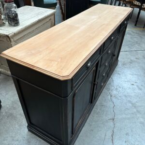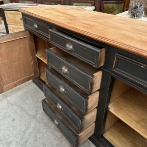 Il se compose d’un corps de meuble patiné noir et d’un plateau en bois brut.
