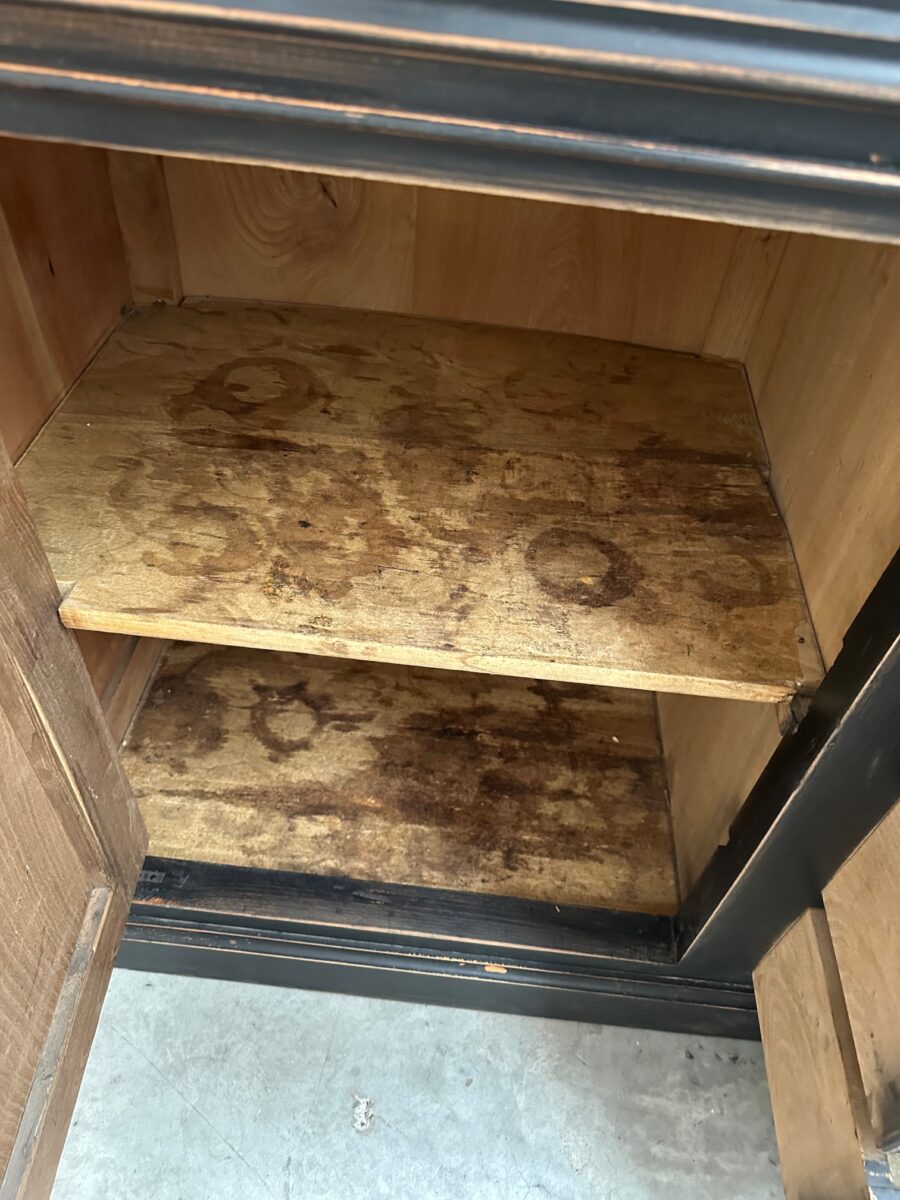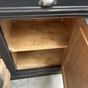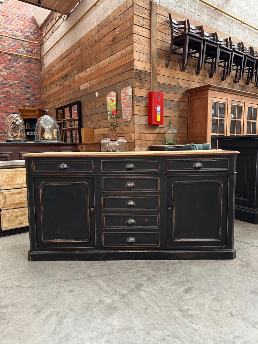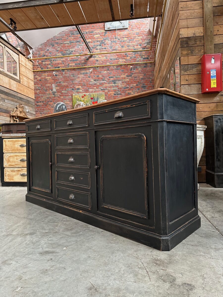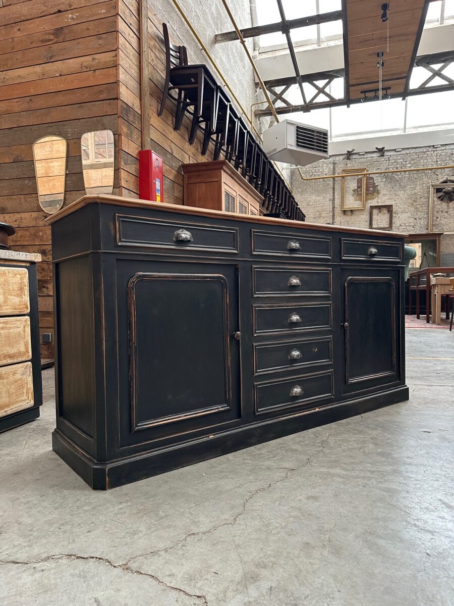 Il se compose d’un corps de meuble patiné noir et d’un plateau en bois brut.
