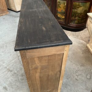 Son corps de meuble est en bois brut et son plateau patiné noir.