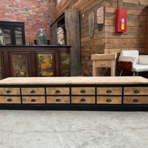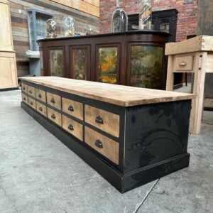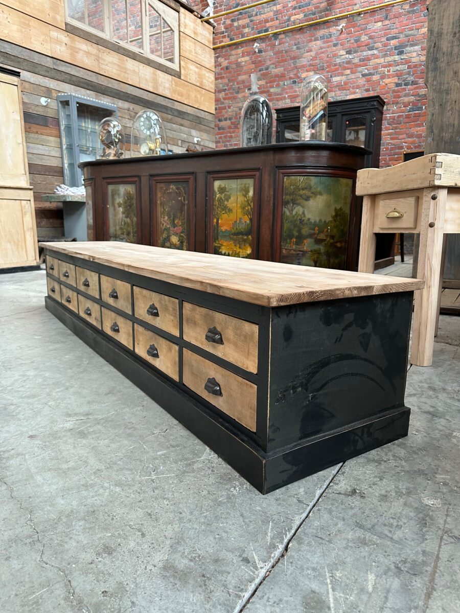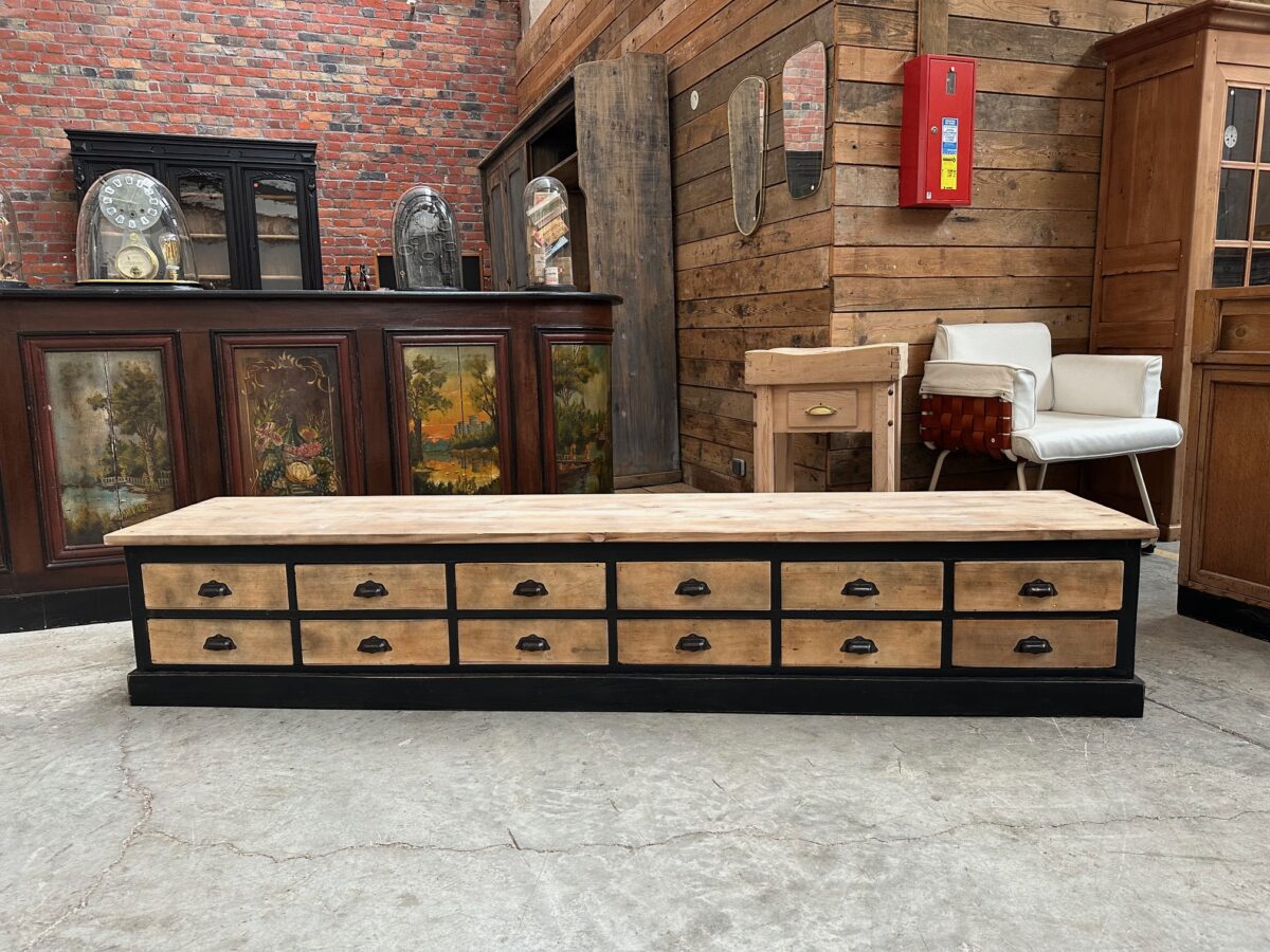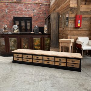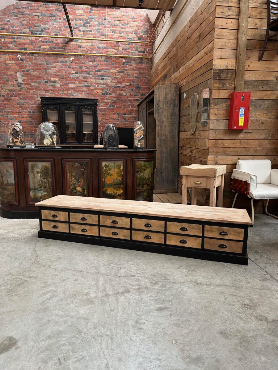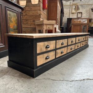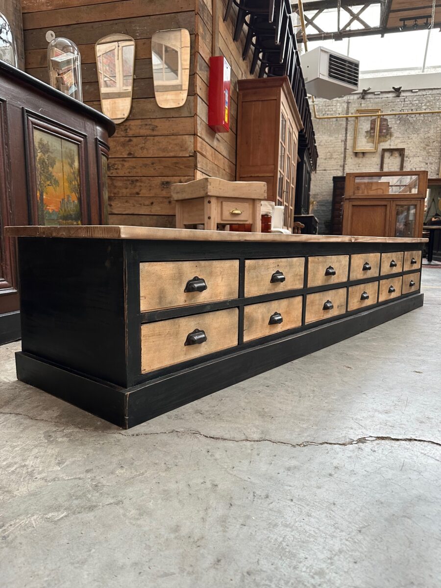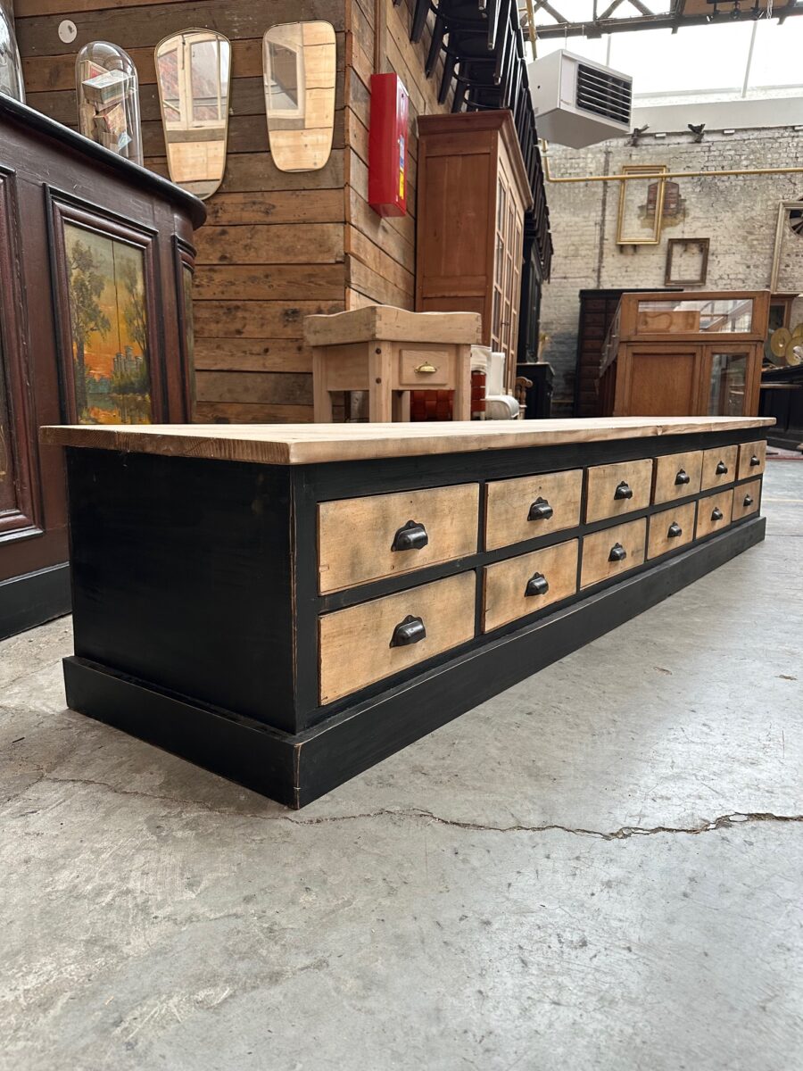 Il se compose d’un corps de meuble en bois patiné noir et d’un plateau et de 12 tiroirs fonctionnels en bois brut.