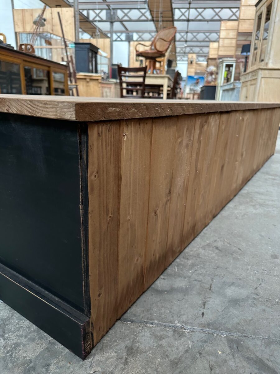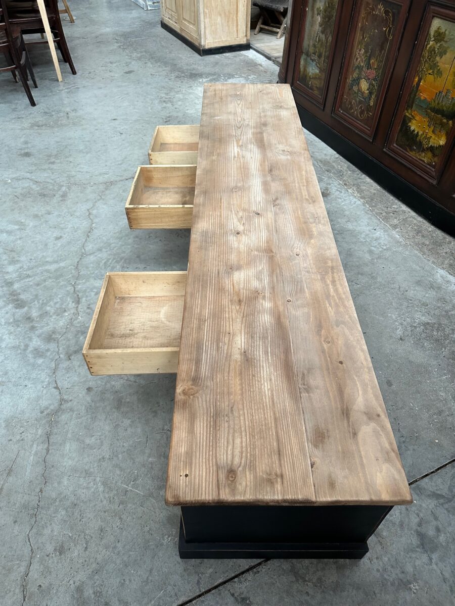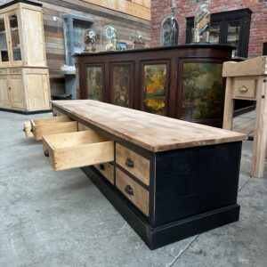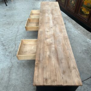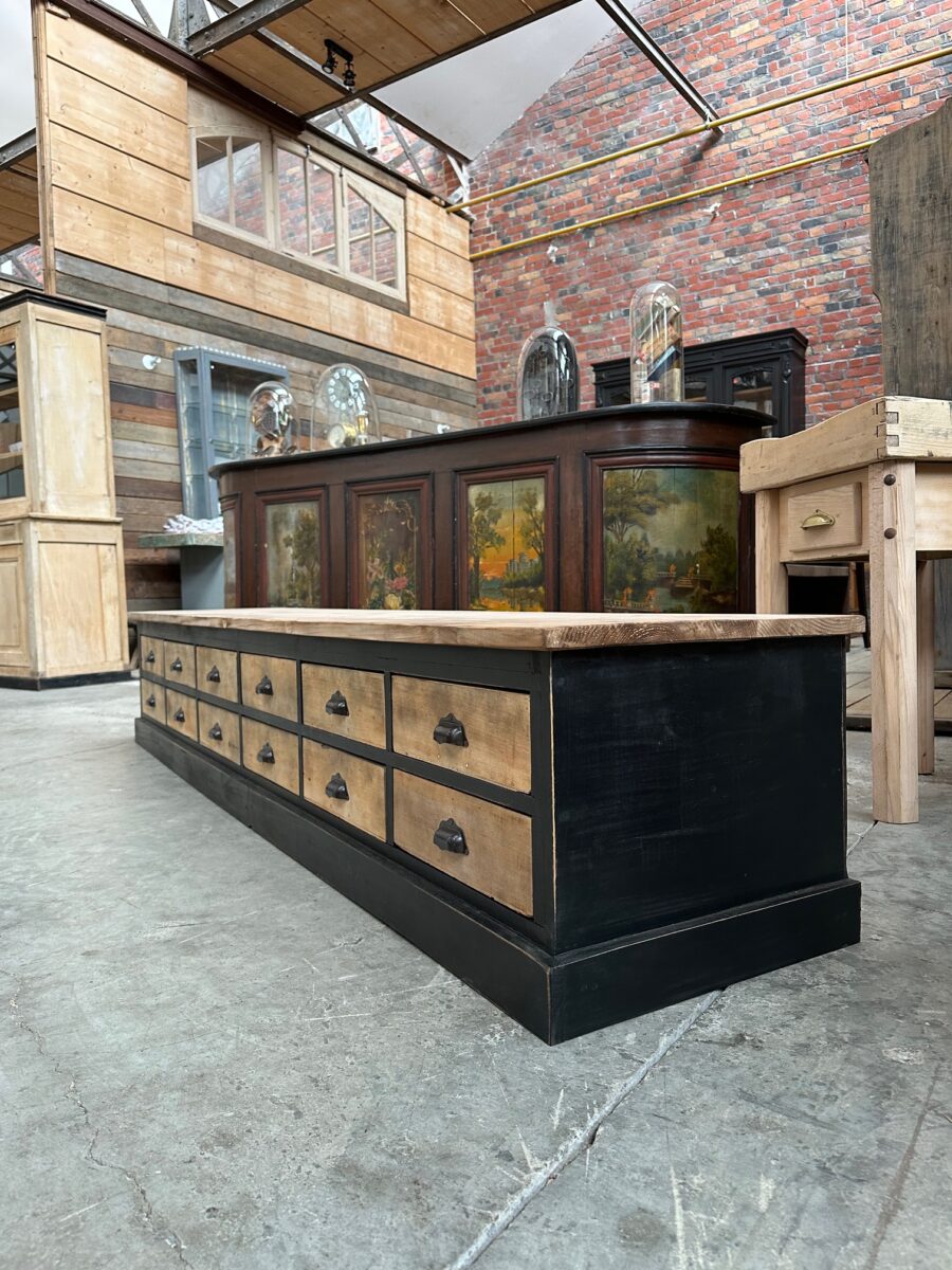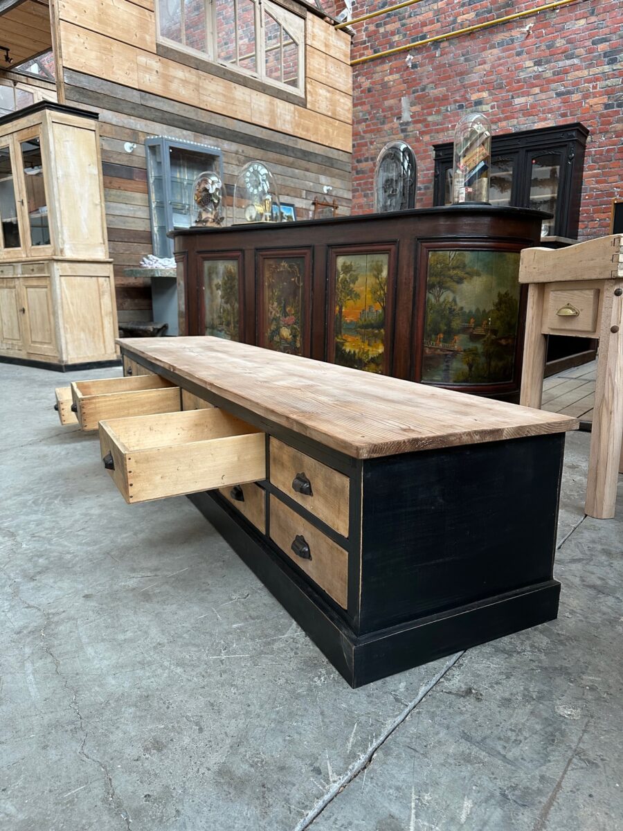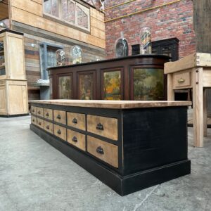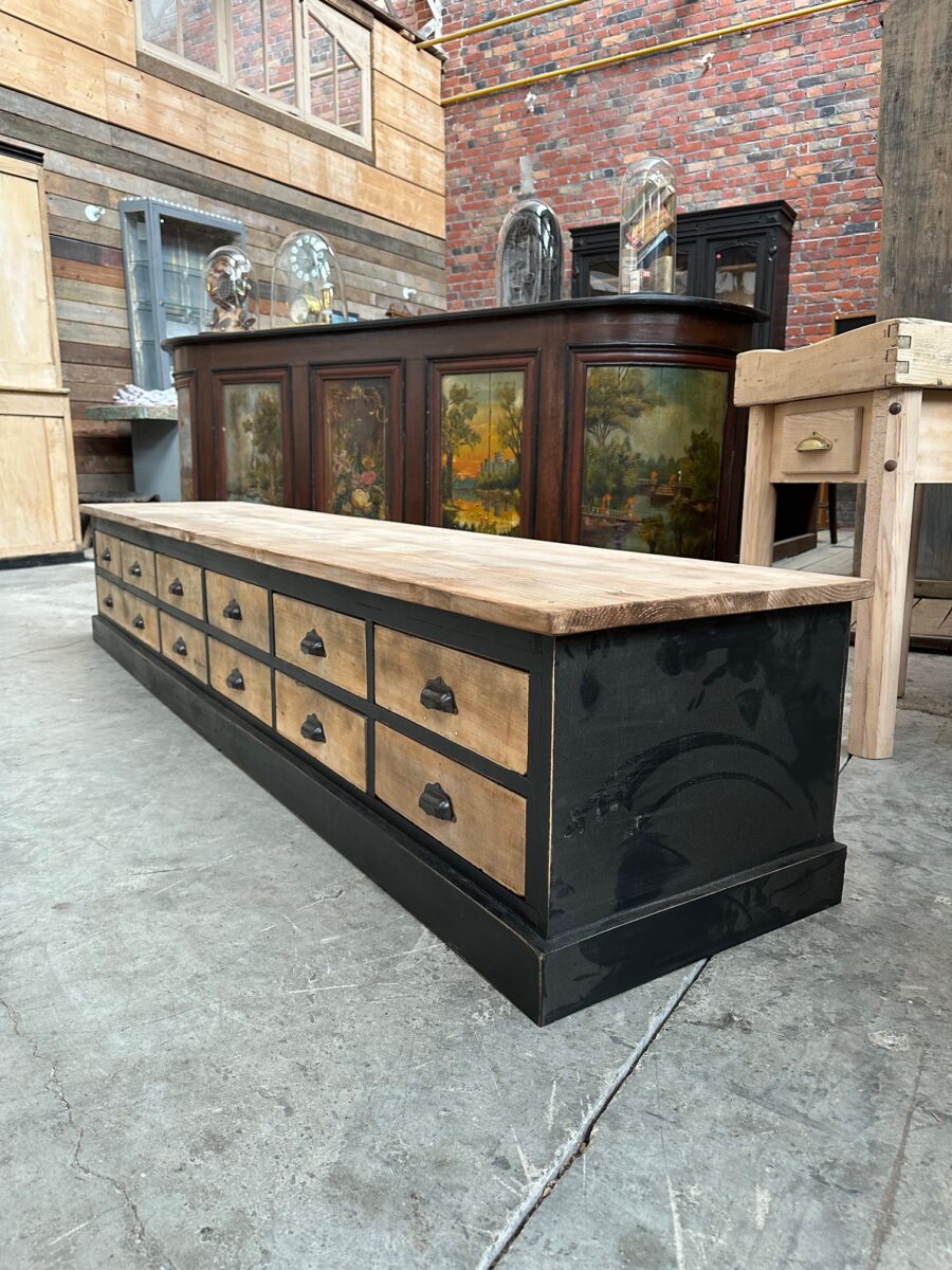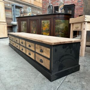 Il se compose d’un corps de meuble en bois patiné noir et d’un plateau et de 12 tiroirs fonctionnels en bois brut.