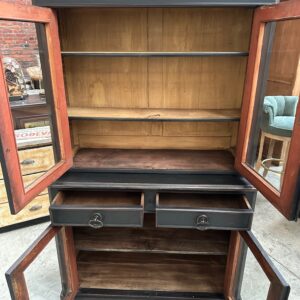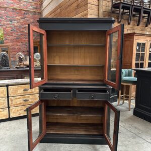 Sa partie basse dispose de 2 tiroirs fonctionnels et de 2 portes vitrées fermant également à clef et ouvrant sur une étagère.