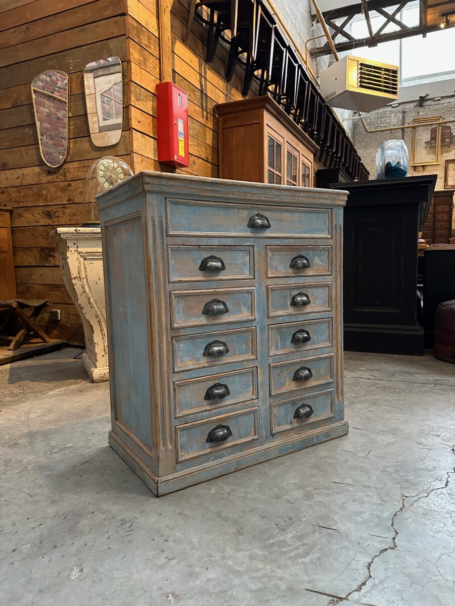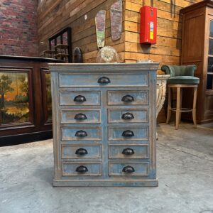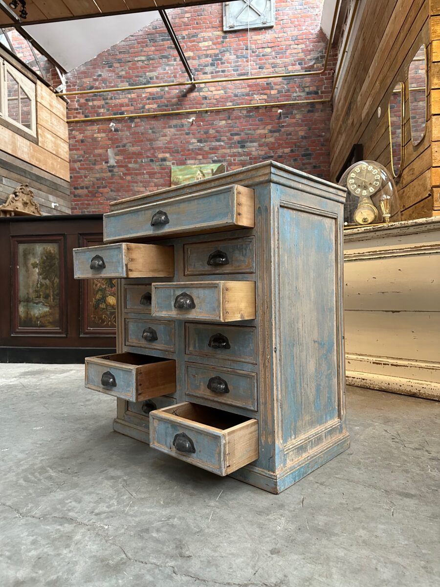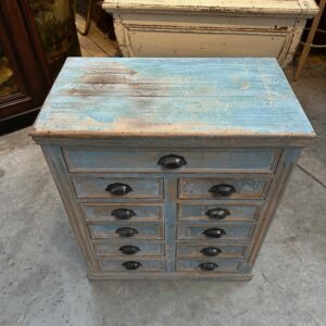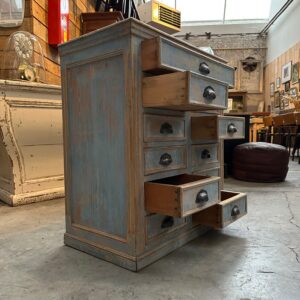 Il dispose d’un grand tiroir fonctionnel et de 10 autres tiroirs plus petits, également fonctionnels et dotés de poignées coquilles.