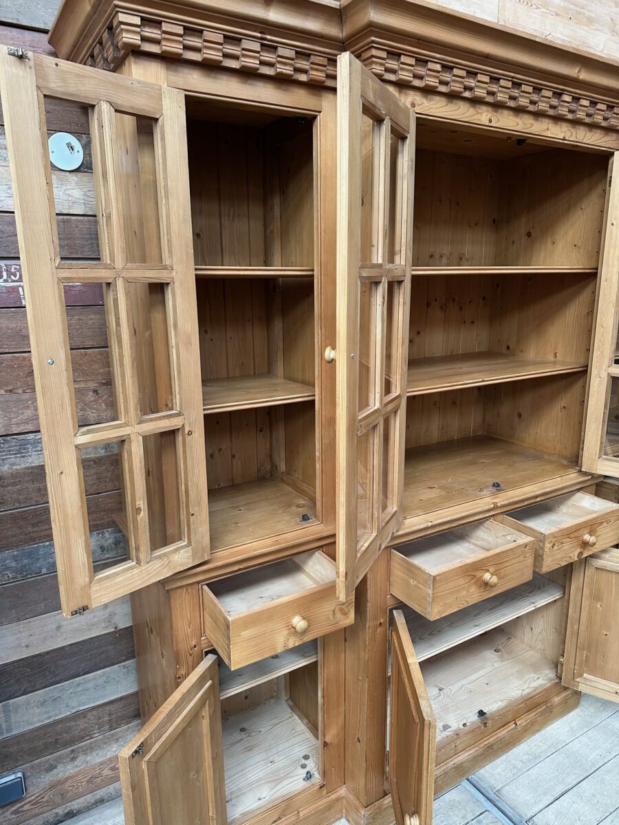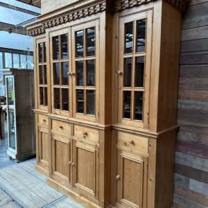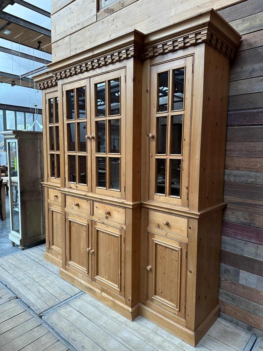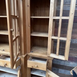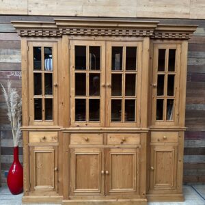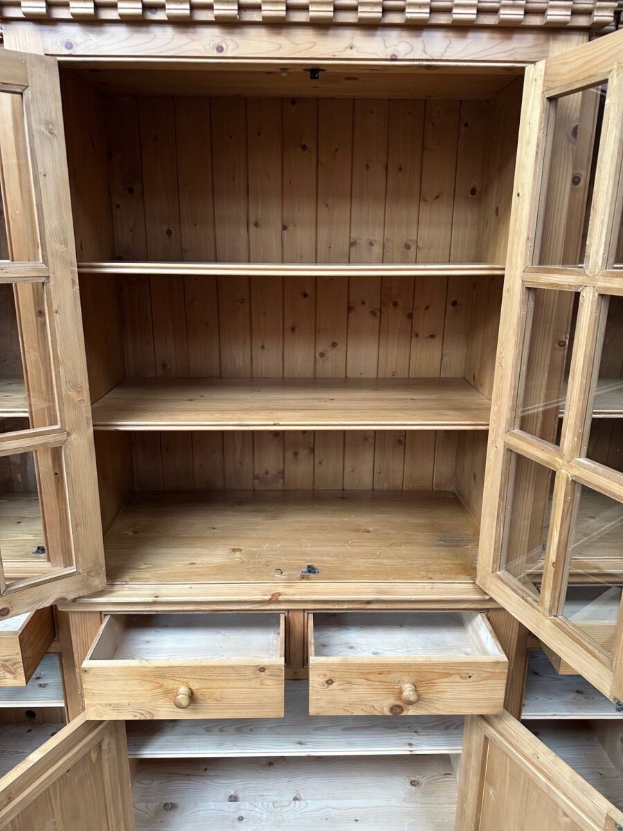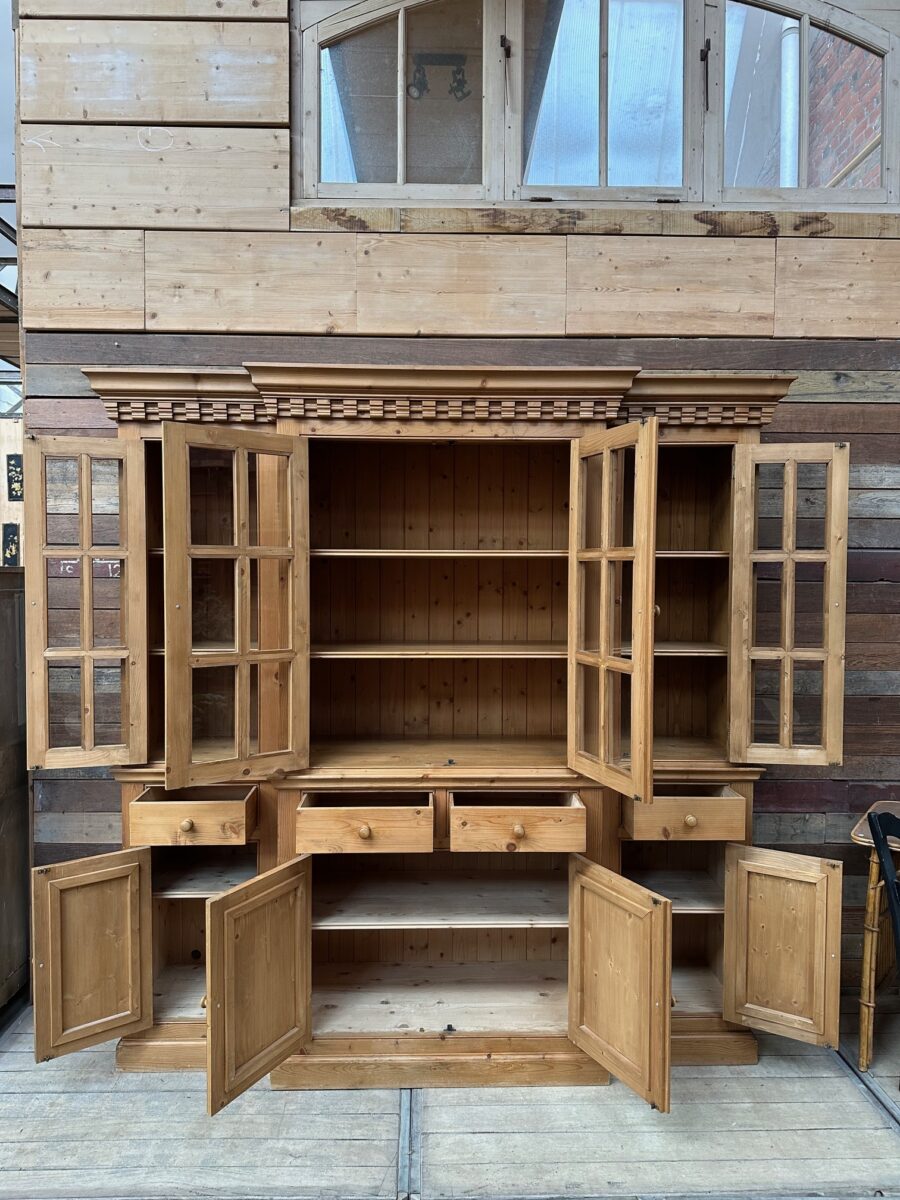 Elle se compose dans sa partie haute de 4 portes vitrées ouvrant sur des étagères et, dans sa partie basse, de 4 tiroirs fonctionnels et de 4 portes pleines ouvrant également sur des étagères.