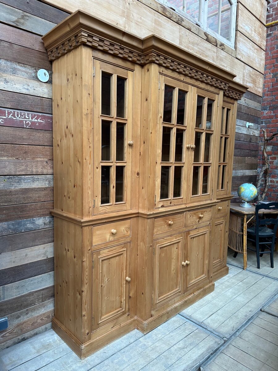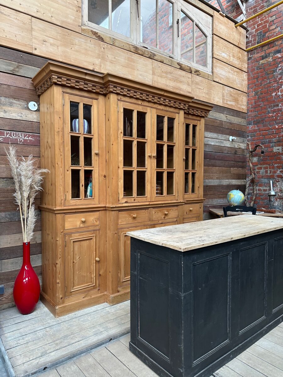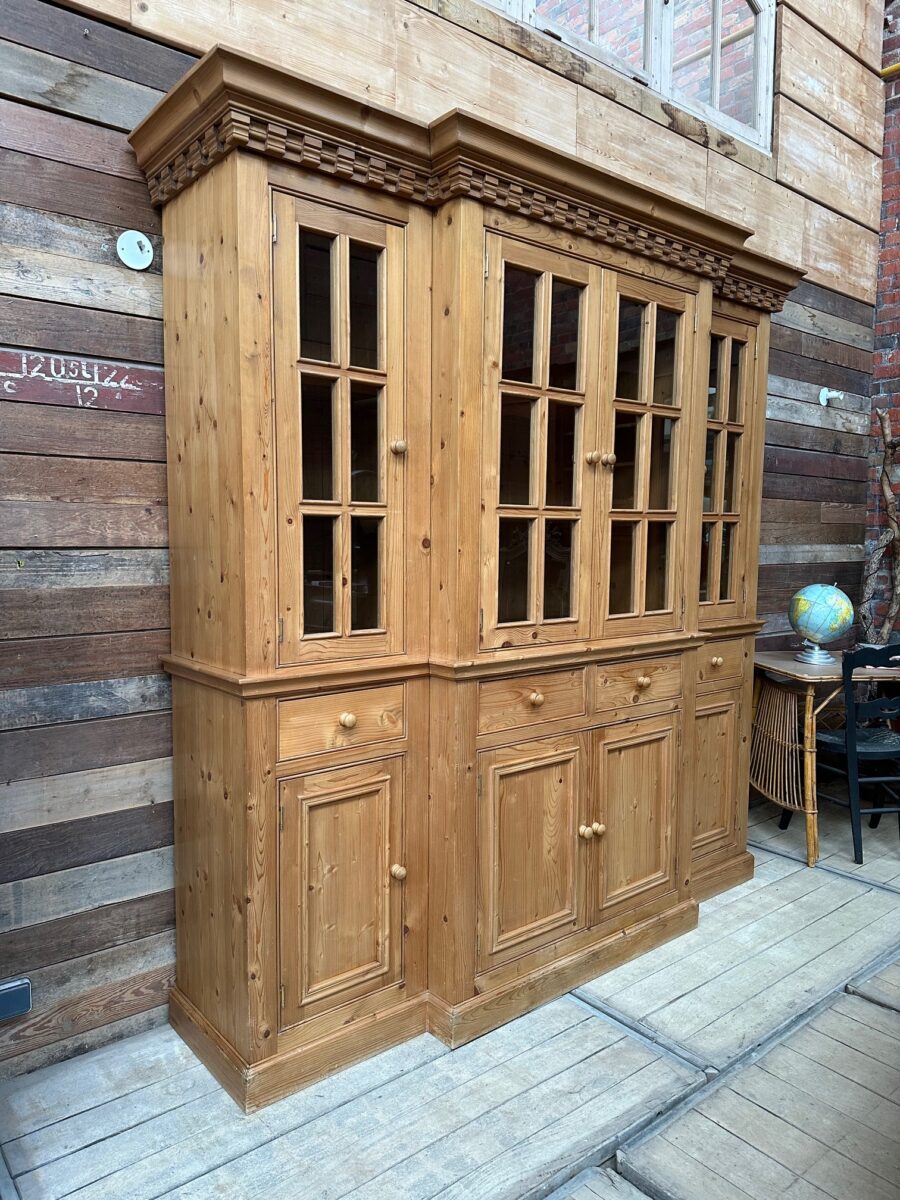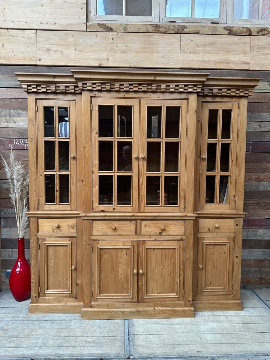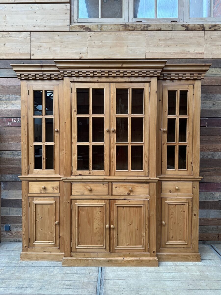 Elle se compose dans sa partie haute de 4 portes vitrées ouvrant sur des étagères et, dans sa partie basse, de 4 tiroirs fonctionnels et de 4 portes pleines ouvrant également sur des étagères.