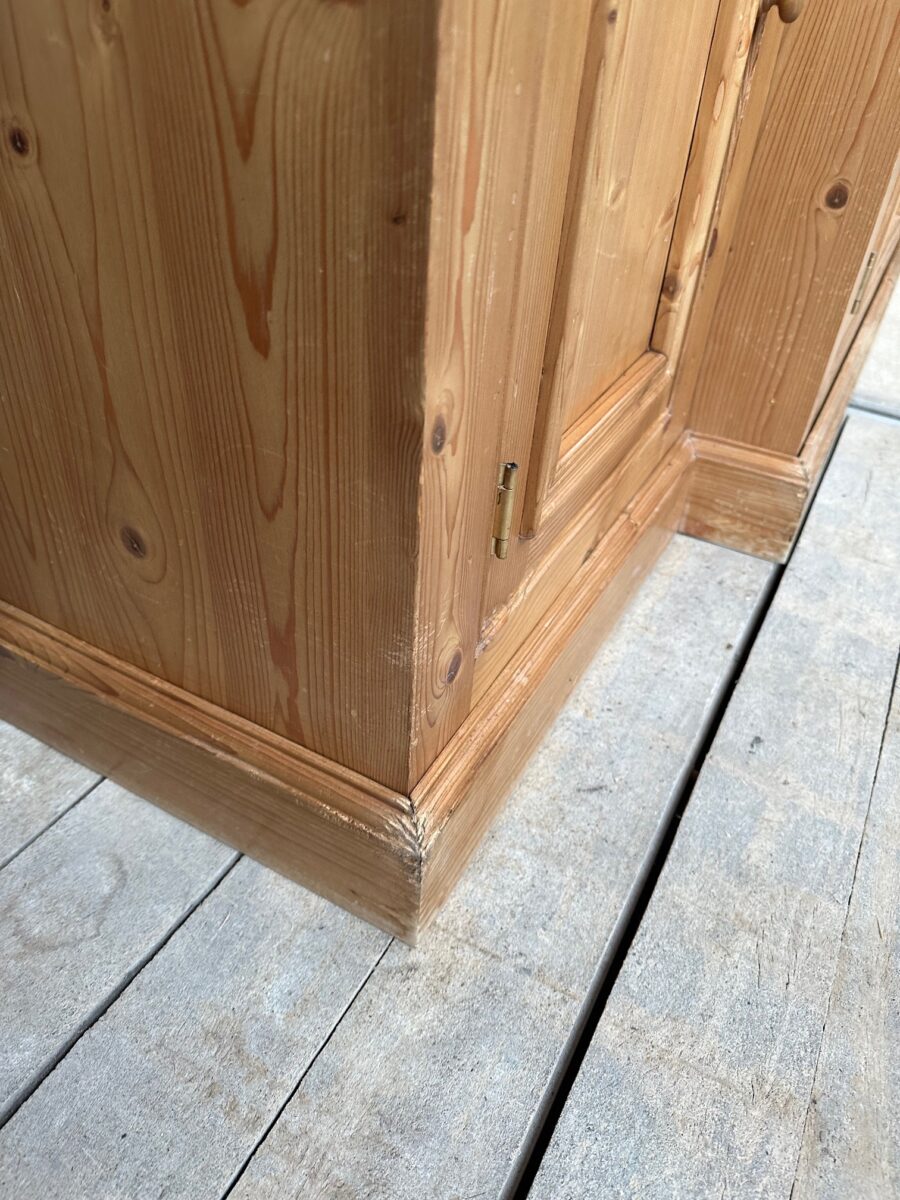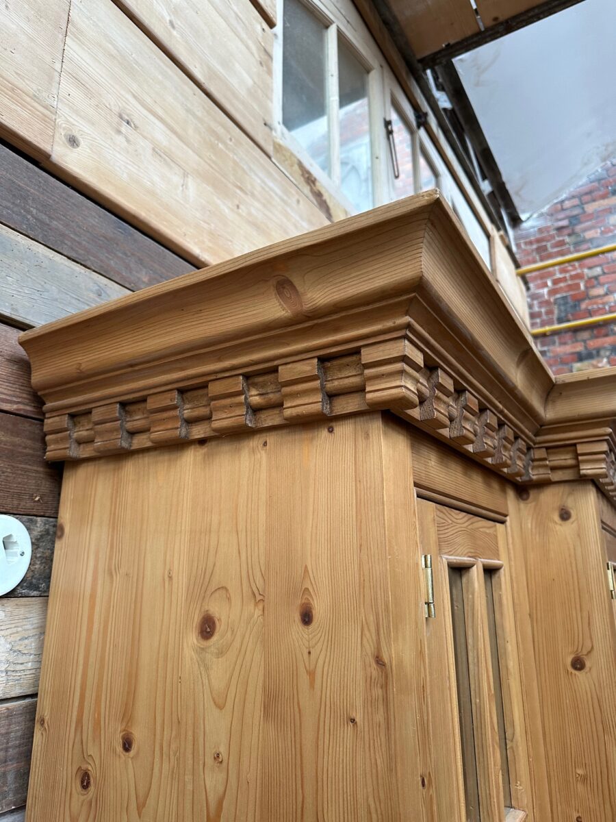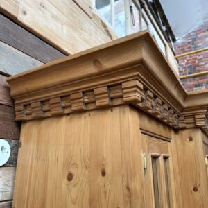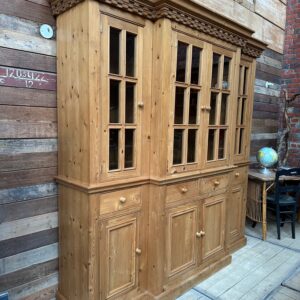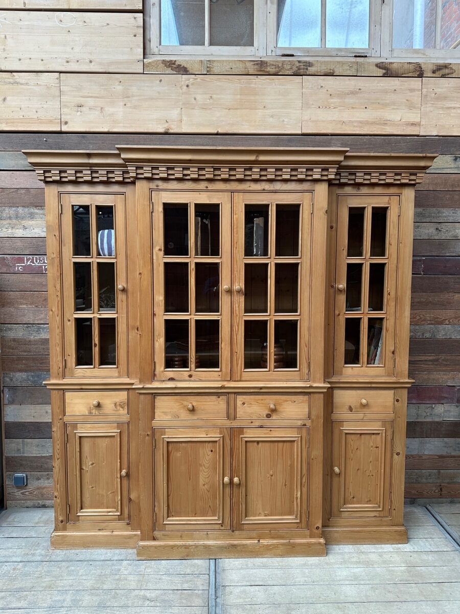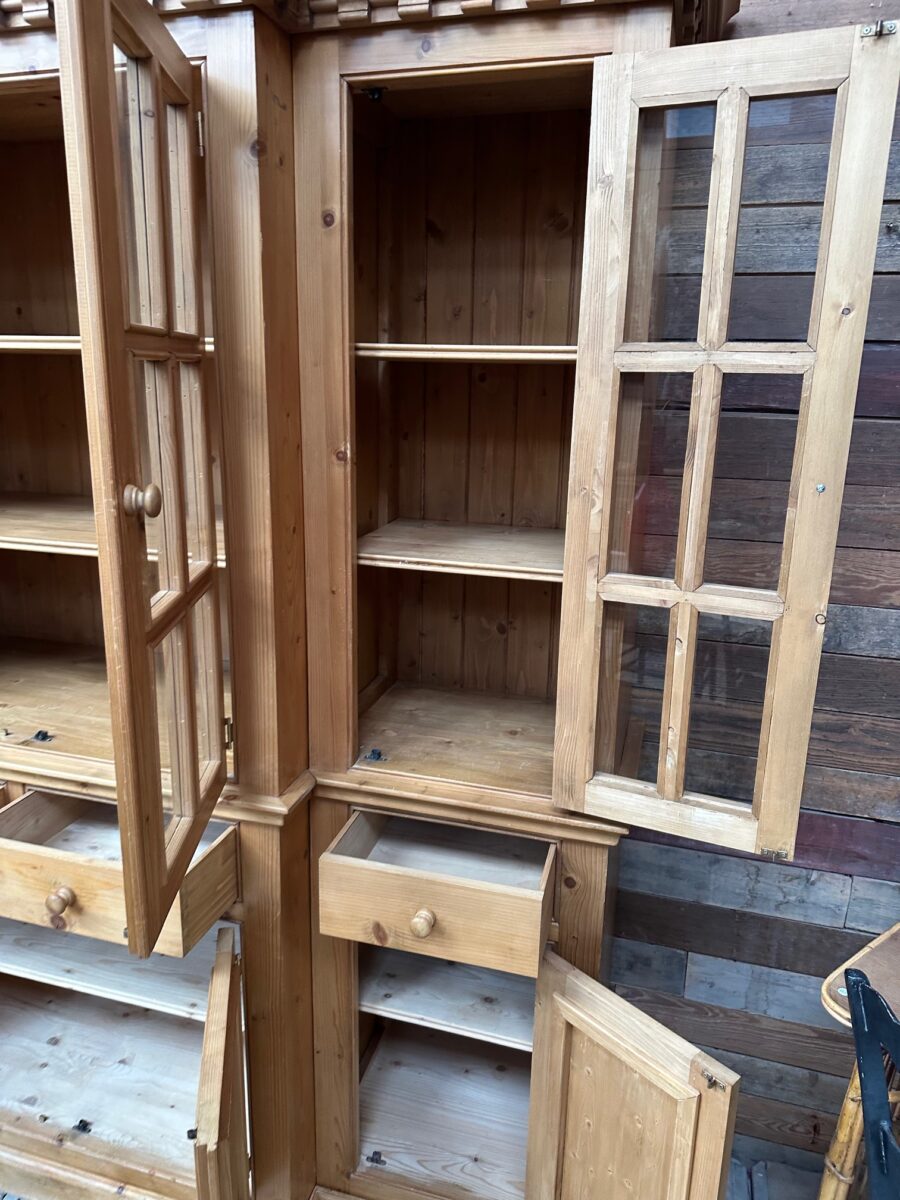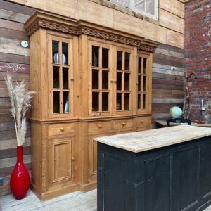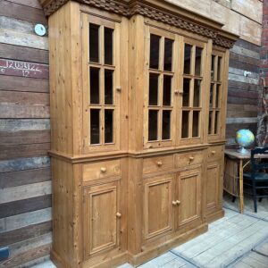 Elle se compose dans sa partie haute de 4 portes vitrées ouvrant sur des étagères et, dans sa partie basse, de 4 tiroirs fonctionnels et de 4 portes pleines ouvrant également sur des étagères.