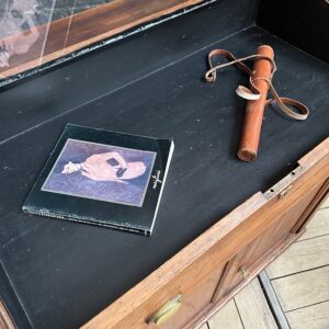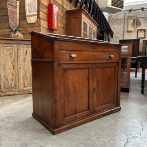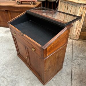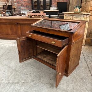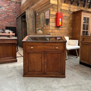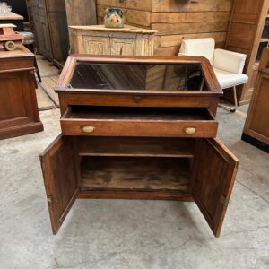 Elle se compose d’une partie haute vitrée, ouvrant sur un espace d’exposition, d’un grand tiroir fonctionnel doté de 2 poignées et de 2 portes pleines ouvrant sur une étagère.