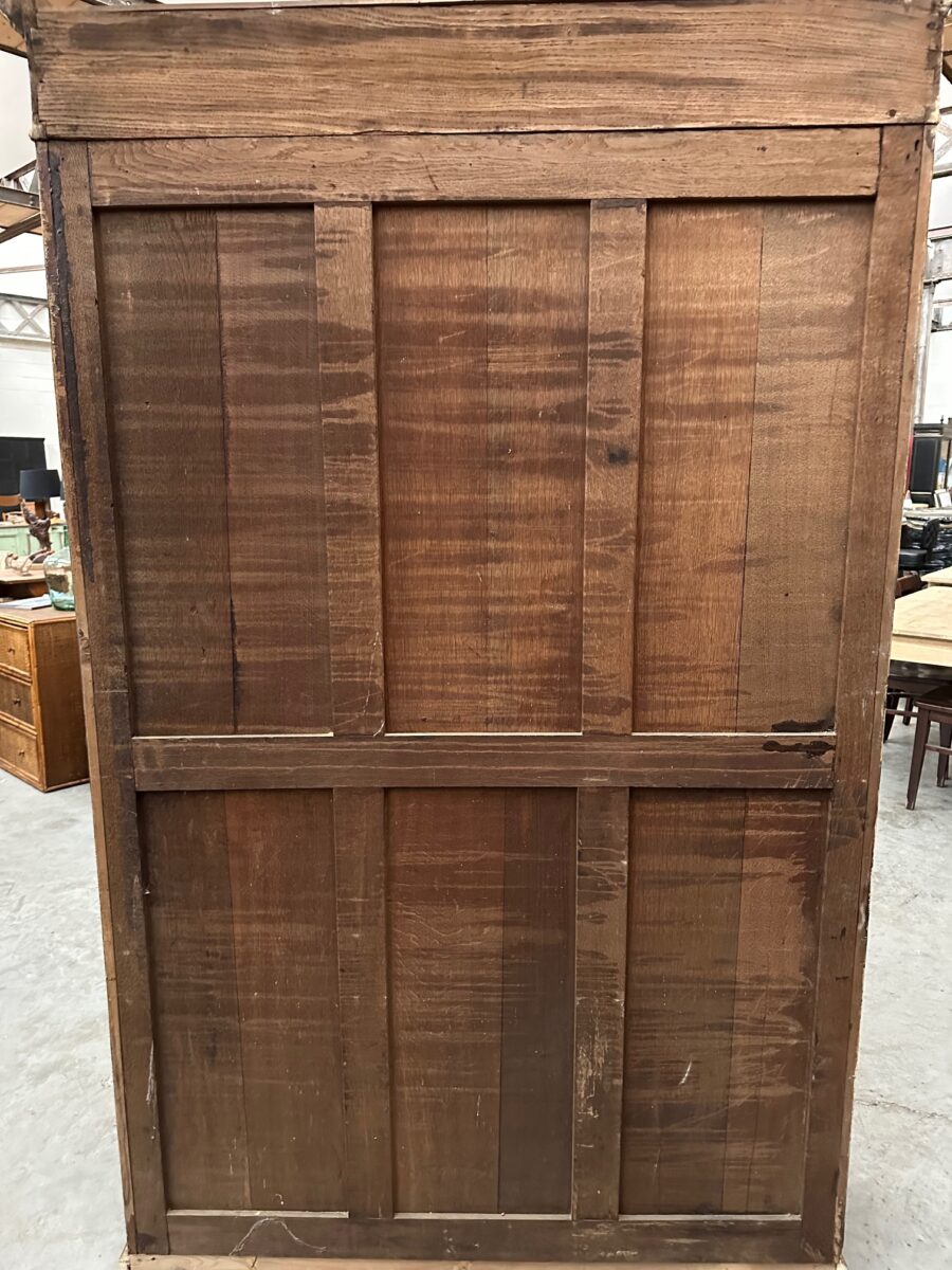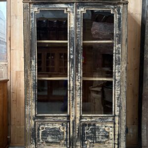 Elle dispose de 2 portes vitrées ayant conservé leur verre d’origine, fermant à clef et ouvrant sur 3 étagères réglables en hauteur.