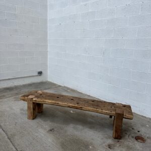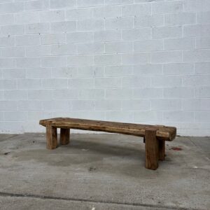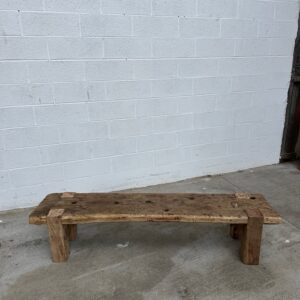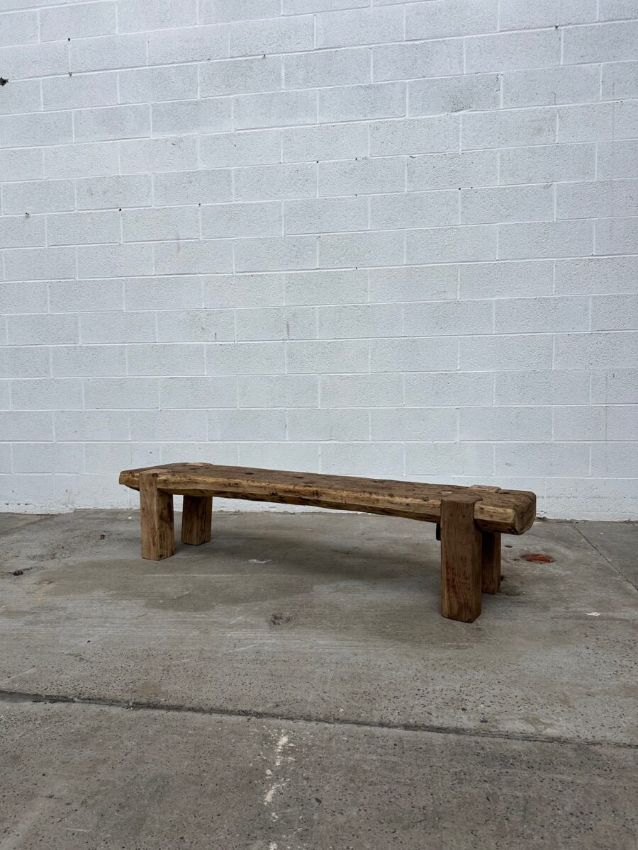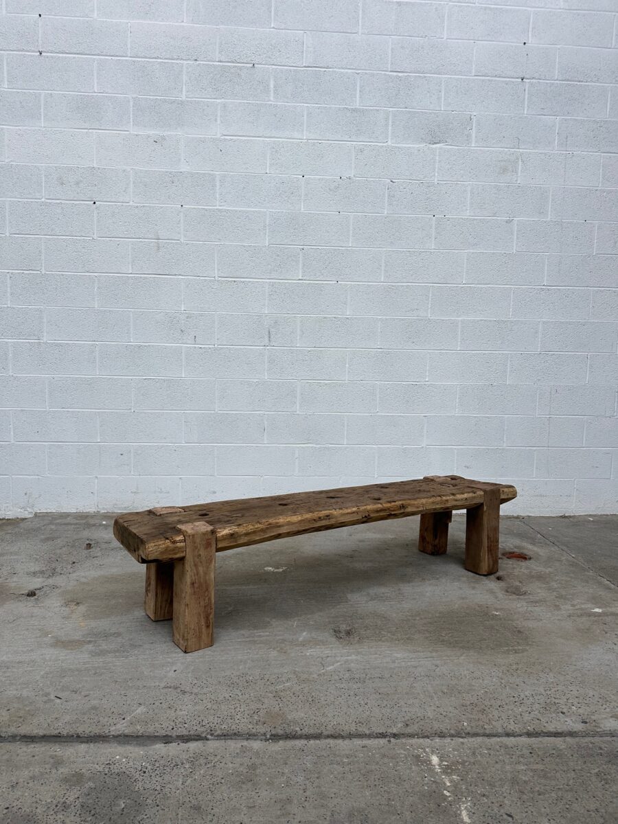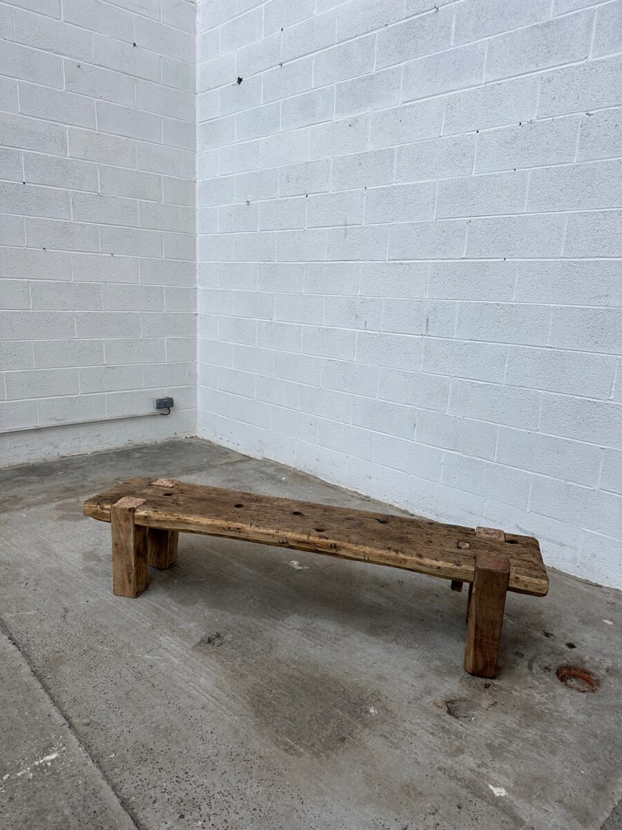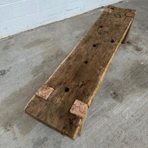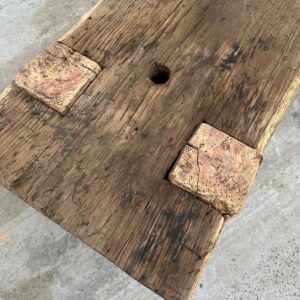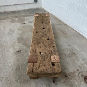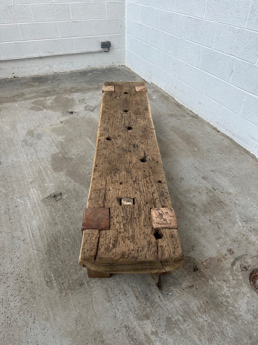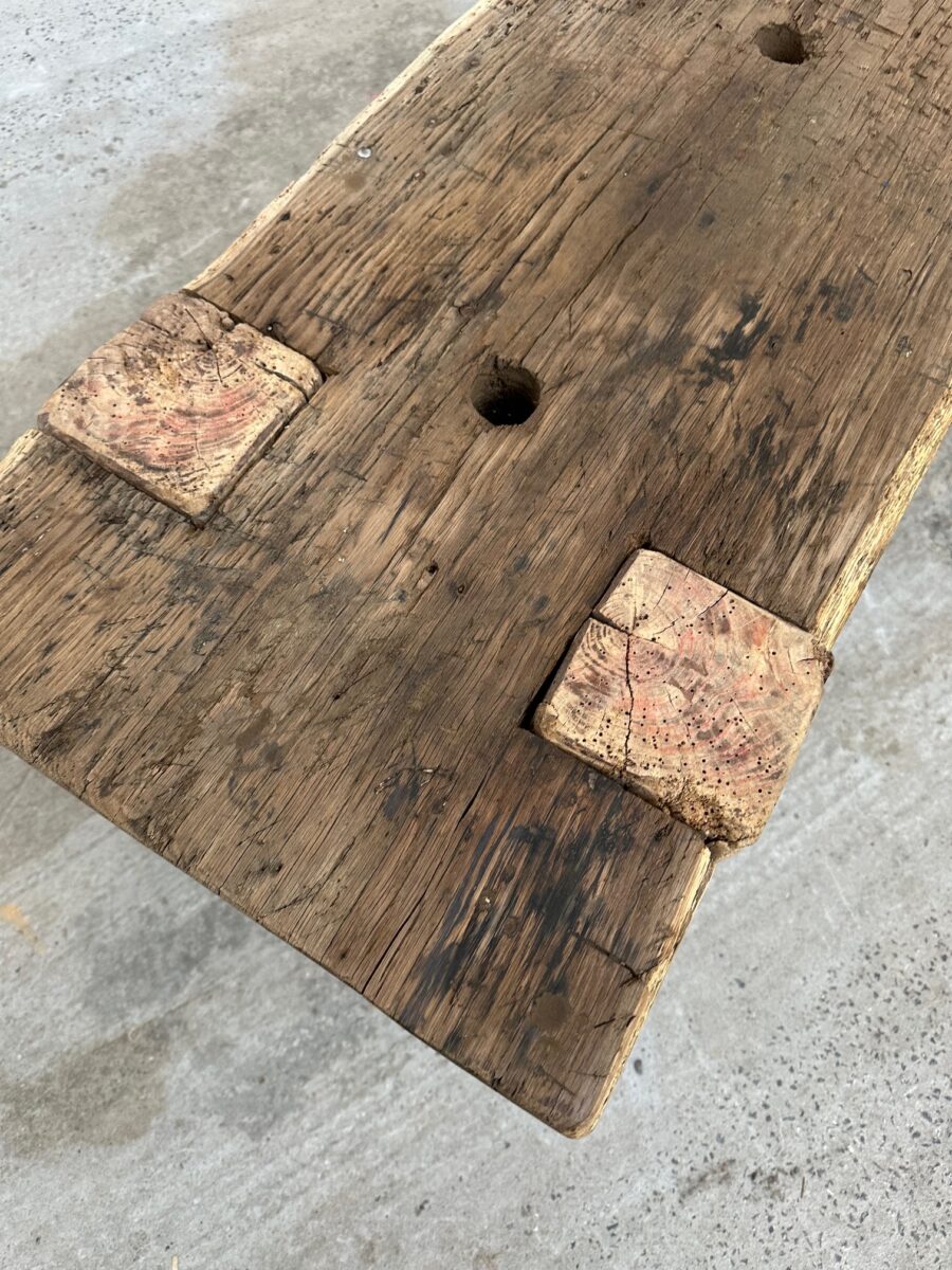 Table basse brutaliste en chêne massif reconstruite sur la bases d’un ancien établi.